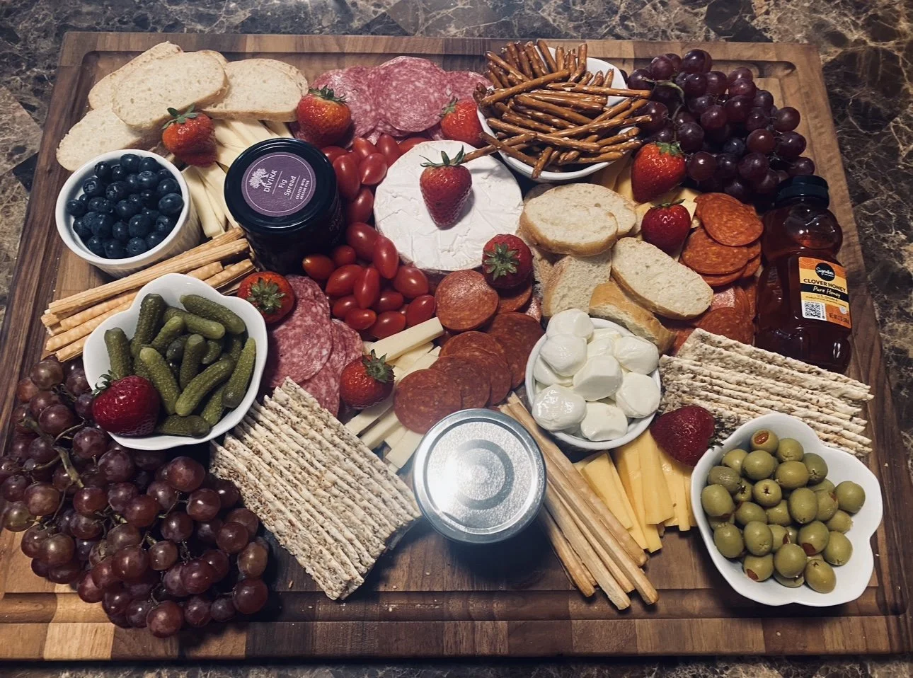 In addition to catering, I host hands-on charcuterie workshops - perfect for anyone who wants to learn how to build their own beautiful boards while enjoying great food, creativity and learning new skills. Currently, I offer classes every other month, and soon they’ll be held monthly! Each workshop is built around a unique theme, often inspired by the season or holiday. My husband, Brandon handcrafts the custom wooden resin boards used in each class- designed specifically to match the theme of the event, every participant gets their own one-of-a-kind-board to use during the class and take home afterward.