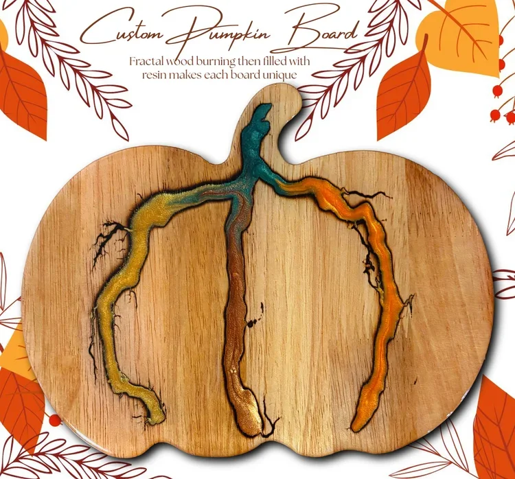 The boards are hand made by Voltage Wood Works with fractal wood burning, next filled with resin then coated with a food-safe lacquer.